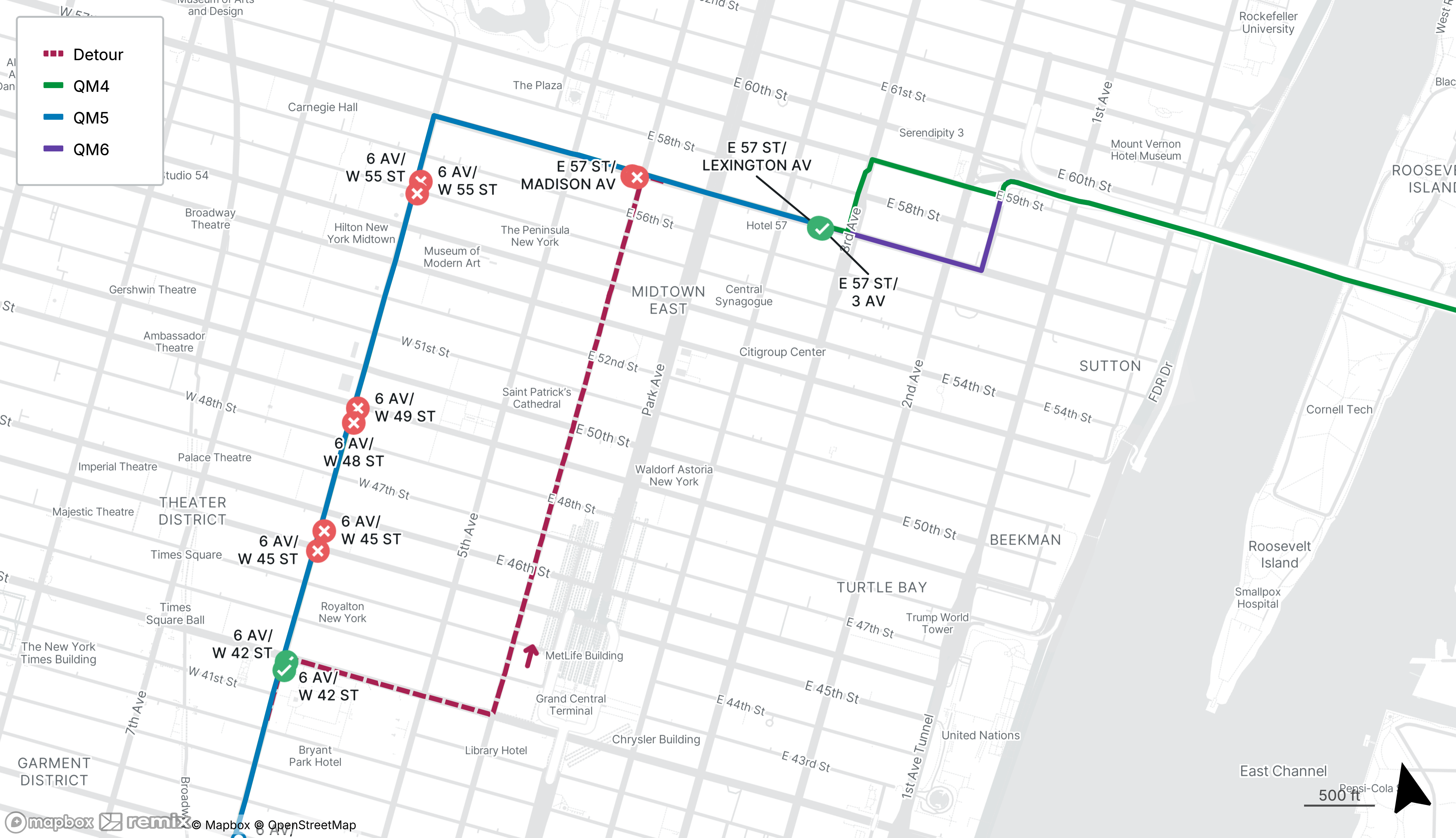 Eastbound QM4, QM5, and QM6 stops on 6th Ave from W 45th St to W 55tth St and on E 57th St at Madison Ave will be closed