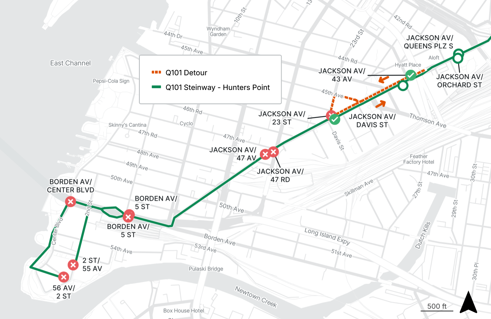 No Q101 service between Hunters Point and Jackson Ave at Davis St