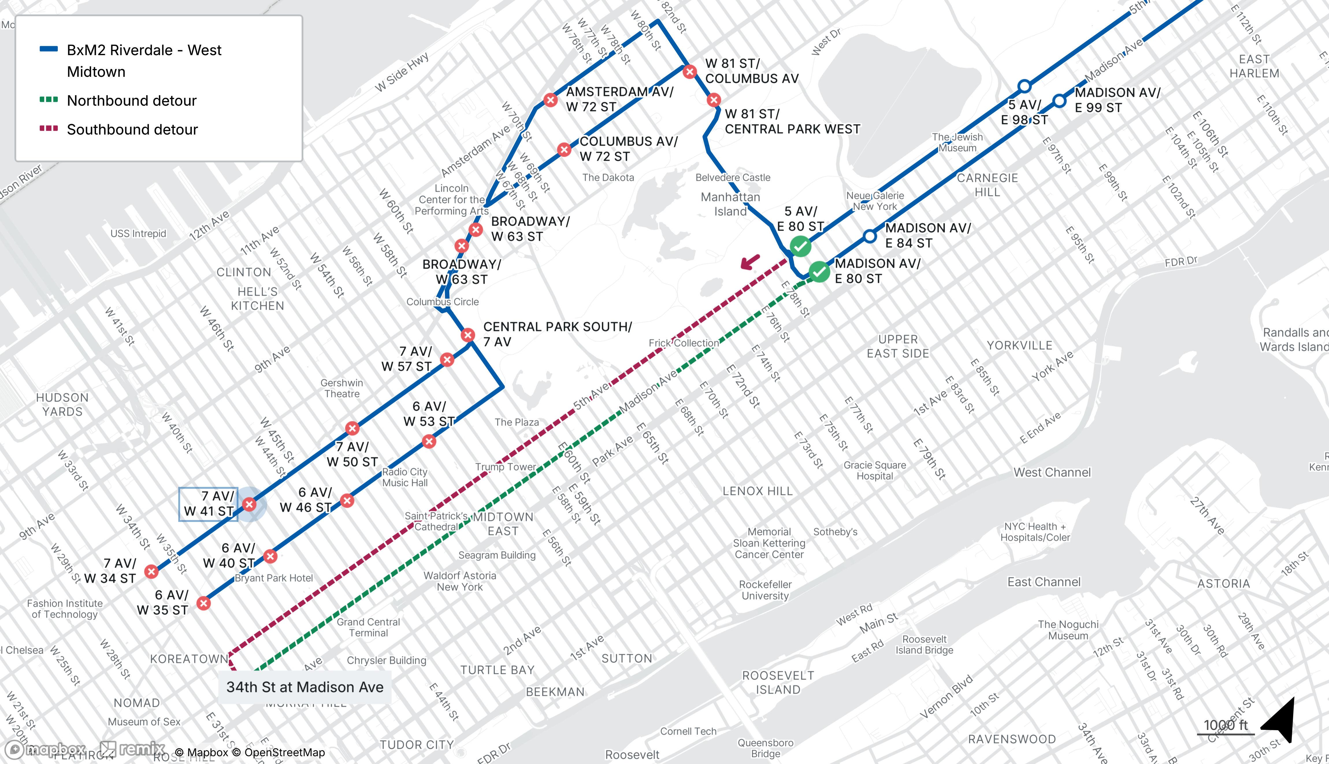 Northbound buses operate via Madison Ave from 34th St to 79th St.