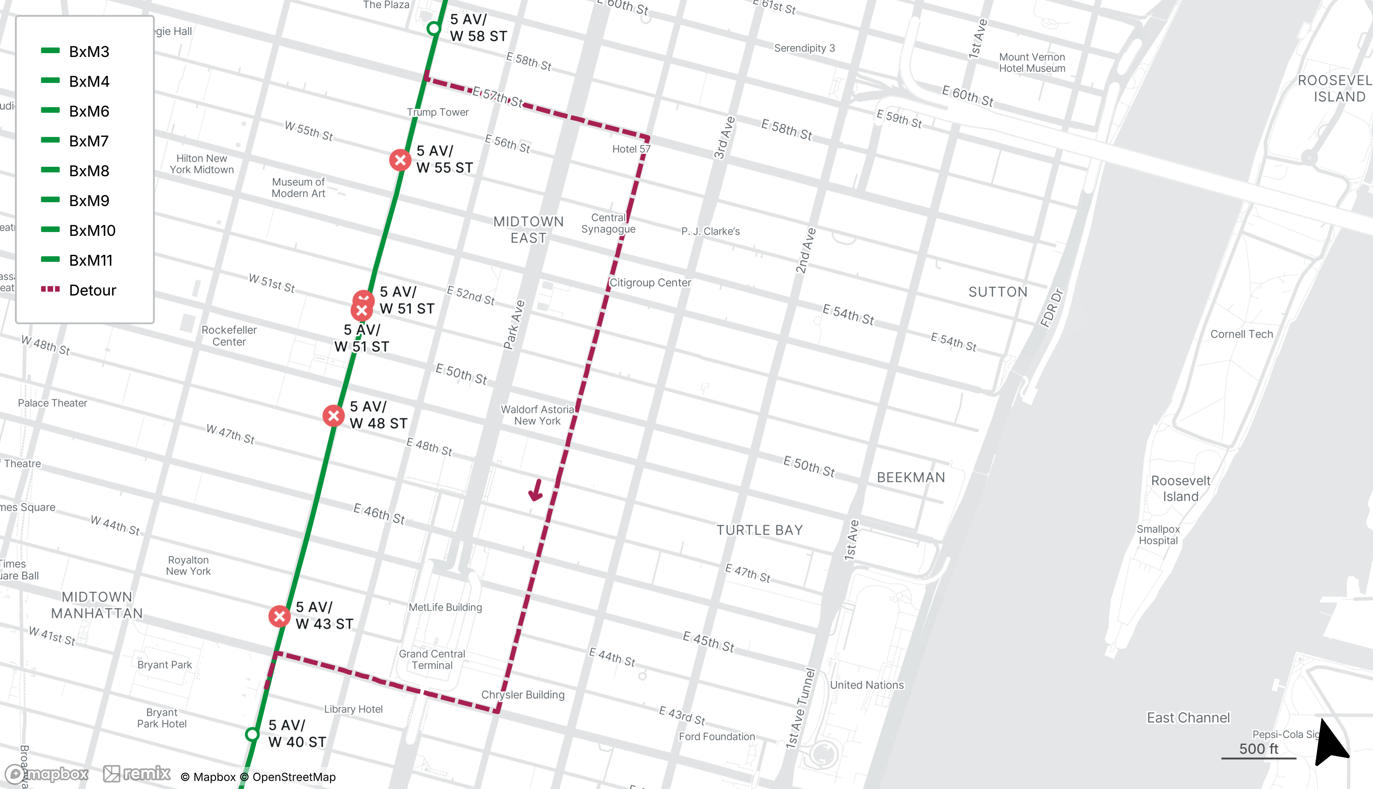 Southbound BxM3, BxM4, BxM6, BxM7, BxM8, BxM9, BxM10, and BxM11 stops on 5th Ave from W 55th St to W 43rd St will be closed