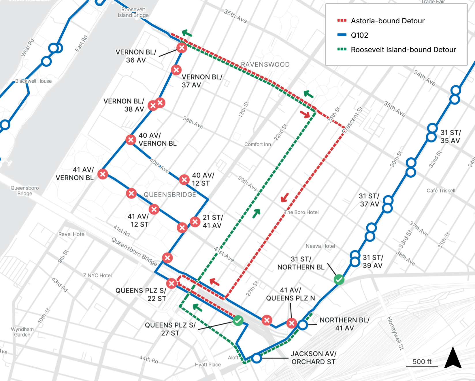 Q63, Q101, and Q102 buses are detoured onto 23rd St between 44th Dr and 42nd Rd/Queens Plaza S in both directions.