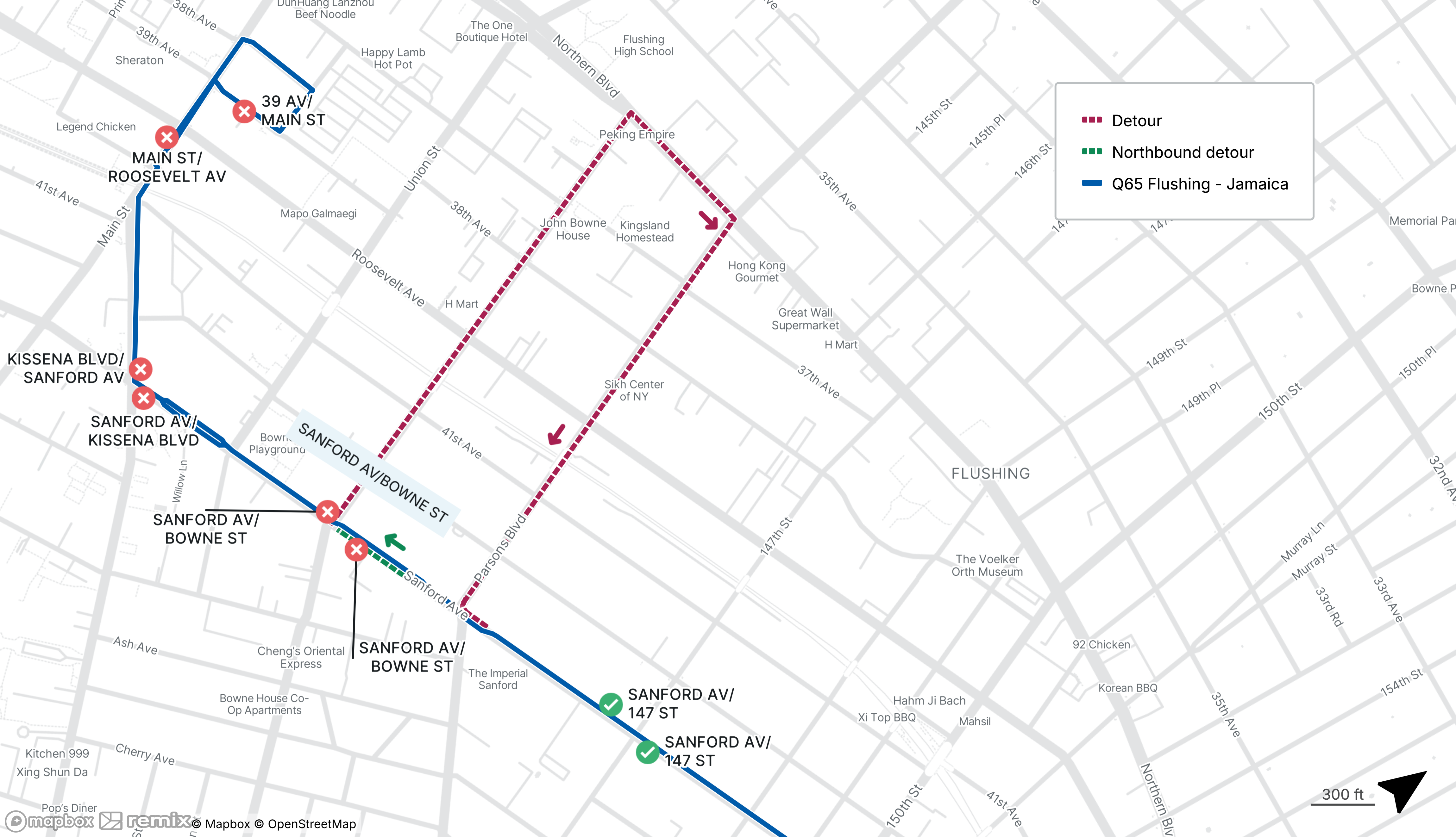 No Q65 service between 39th Ave at Main St and Sanford Ave at Bowne St