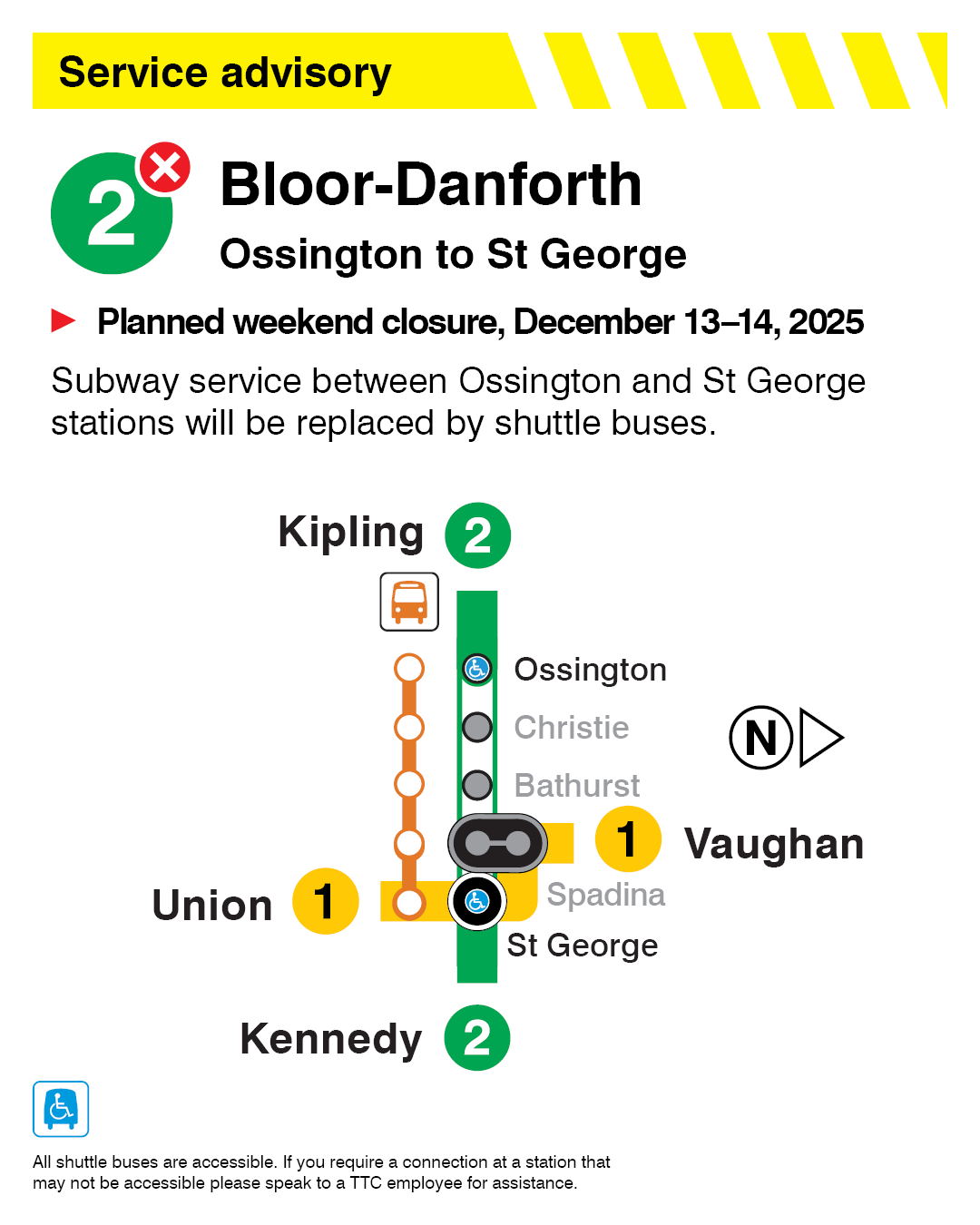 Line 2 Bloor-Danforth: This weekend, there will be no subway service between Ossington and St George stations due to planned track work. Shuttle buses will operate.