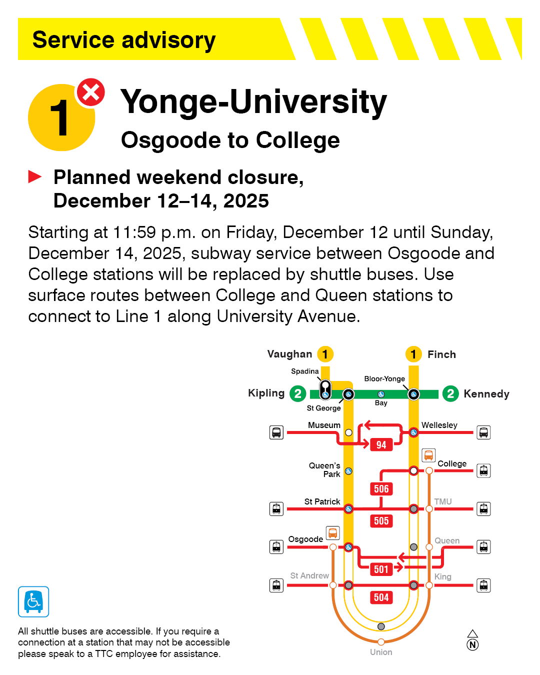 Line 1 Yonge-University: This weekend, starting at 11:59 p.m. tonight, there will be no subway service between Osgoode and College stations due to planned track work. Shuttle buses will operate.