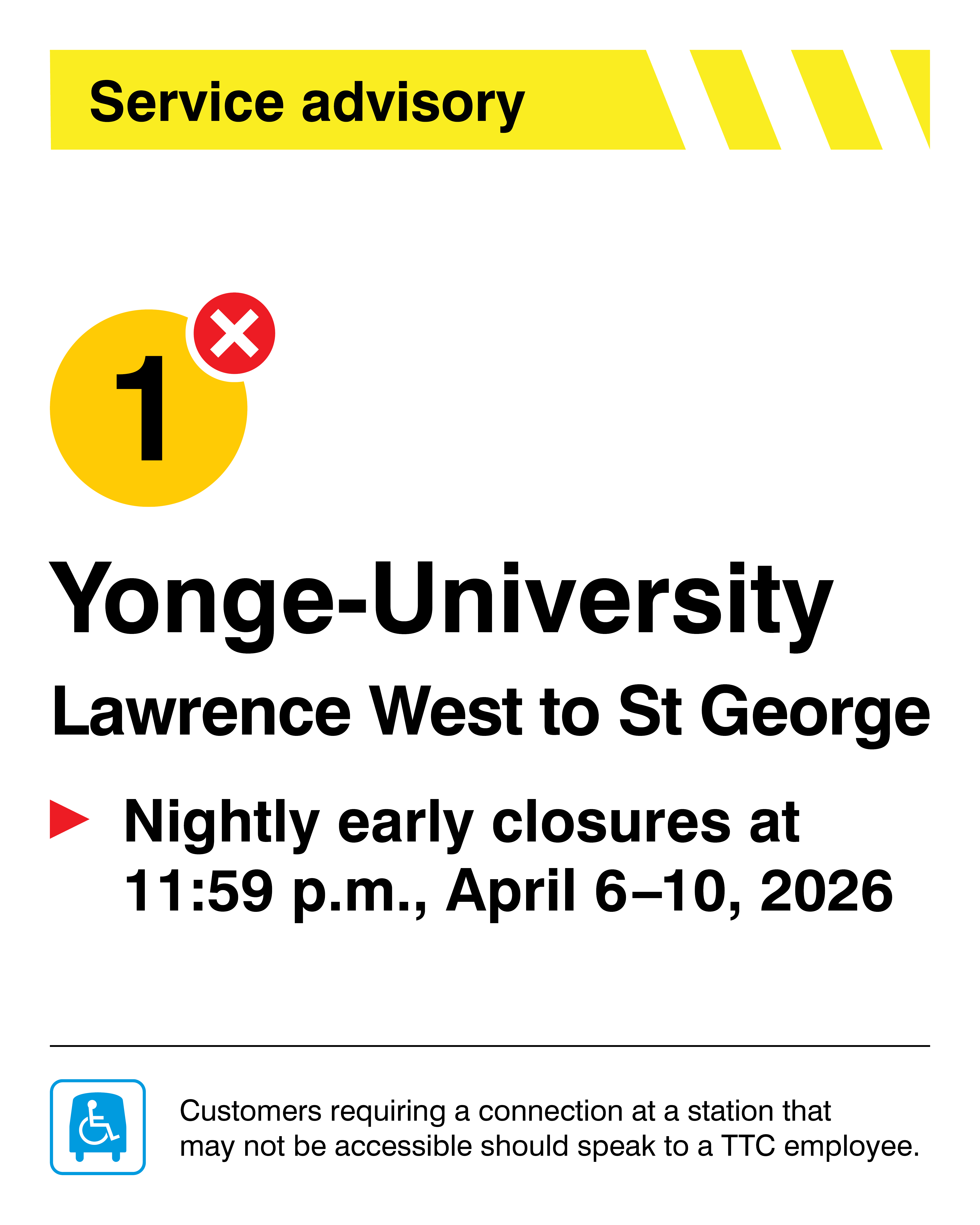 Line 1 Yonge-University: There will be no subway service between Lawrence West and St George stations, starting 11:59 p.m., nightly Monday, April 6 to Friday, April 10, due to planned station work. Shuttle buses will operate between Lawrence West and St George.